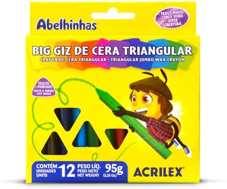Ideal para uso na pré-escola e em trabalhos escolares diversos. Suas três faces permitem um perfeito apoio dos dedos. Fabricado com ceras de alta qualidade. Formato anatômico que facilita o manuseio. Conteudo da Embalagem: 01 CX com 12 unidades em cores variadas Big Giz de Cera